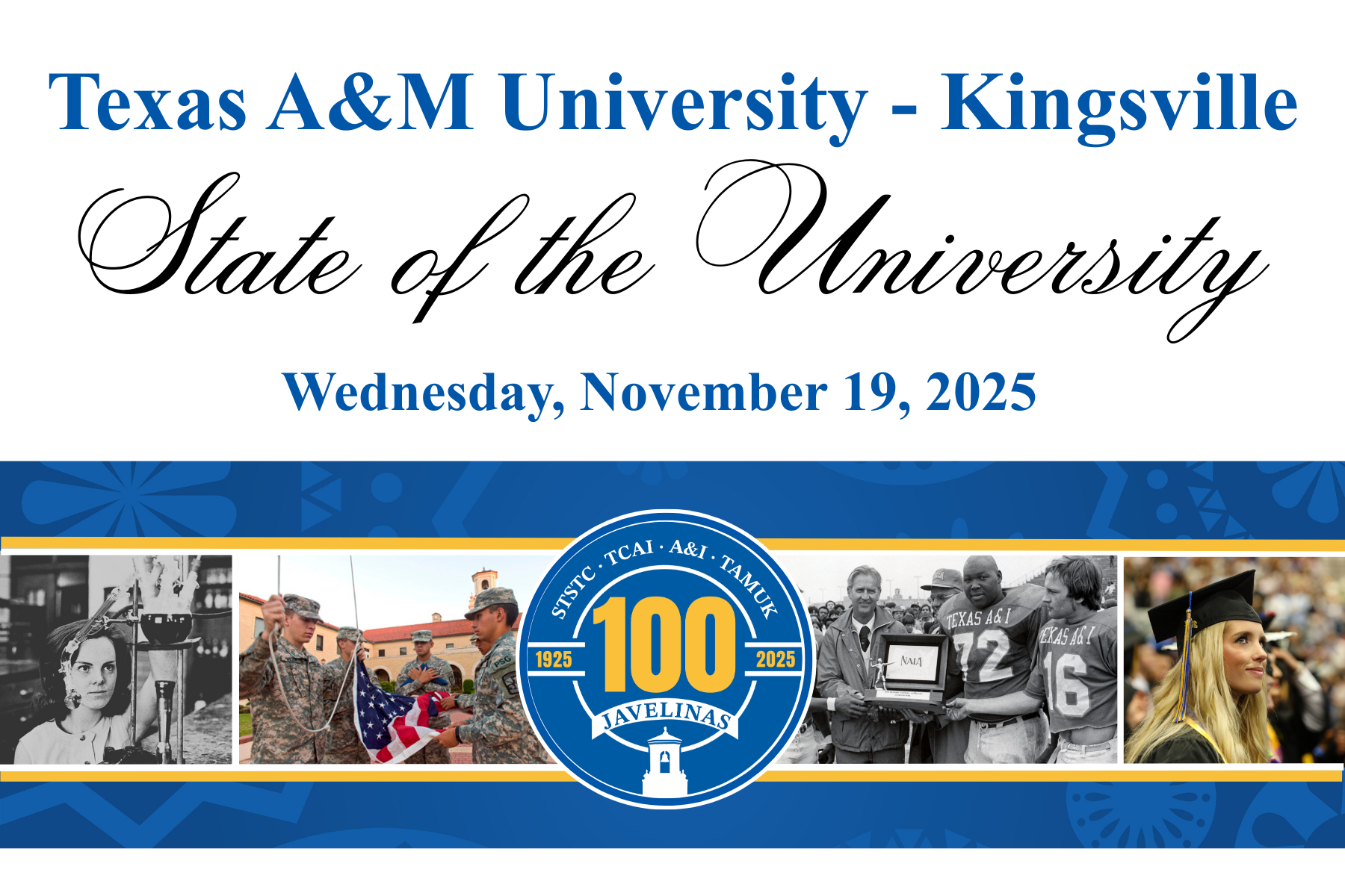 Join us for the 2025 State of the University Address on Wednesday, November 19, at 11:00 A.M. at the Caesar Kleberg Wildlife Research Center. Hear important updates, celebrate recent achievements, and learn about the bold vision guiding the future of Texas A&M University-Kingsville.